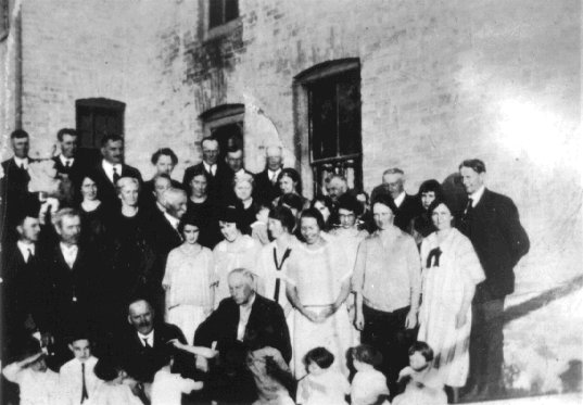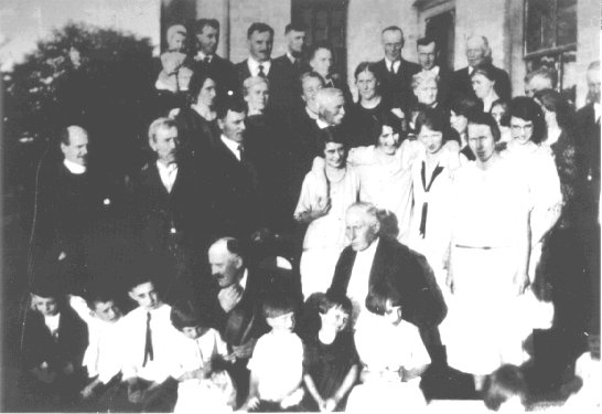 John Alexander Ross (A3A) [seen at the upper left in both pictures holding his daughter Alma], was secretary-treasurer of the monument planning committee. His records indicate that contributions were made by descendants in all surviving branches. Reverend John A. Ross (A8) [seen behind the children at the front and centre of the photo], chaired both meetings which were held prior to the unveiling. [Details may be found on pages 207-214 in Our Ross Family Story. Sketches and a summary are on pages 149-150] On June 16, 1925, a monument dedicated to Alexander Ross and Margaret Noble was unveiled by their descendants at the pioneer Bethel Cemetery [located on the north-east corner of Lot 11 N½ Concession 10 of Arthur Township, north of Farewell]. The girls [centrally located in the photographs], who unveiled the monument, were Margaret Ellen Ross (G2F), Marjorie Isobel Ross (A8D), Jessie Margaret Ross (A3A1) and Ethel Euphemia Ross (A3A2). The minister, Reverend Gilbert Gomm, and some members of the recently renamed Zion United Church in Cotswold were invited to join the descendants. The above pictures were taken back at the home of John Alexander Ross after the ceremony. Peter H. Ross (A3D) had a major responsibility for the items required for the supper [and $13.28 fed about 50 persons!]. This gathering was a fore-runner to the annual Ross Family Reunions which began in 1929. |