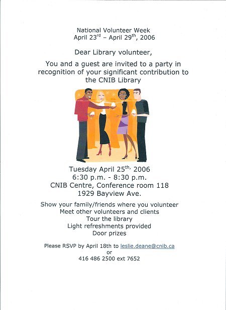 | CNIB VOLUNTEERS PARTY 2006  Please visit the CNIB website for more information. CLICK on any of the following photos to obtain a larger version.