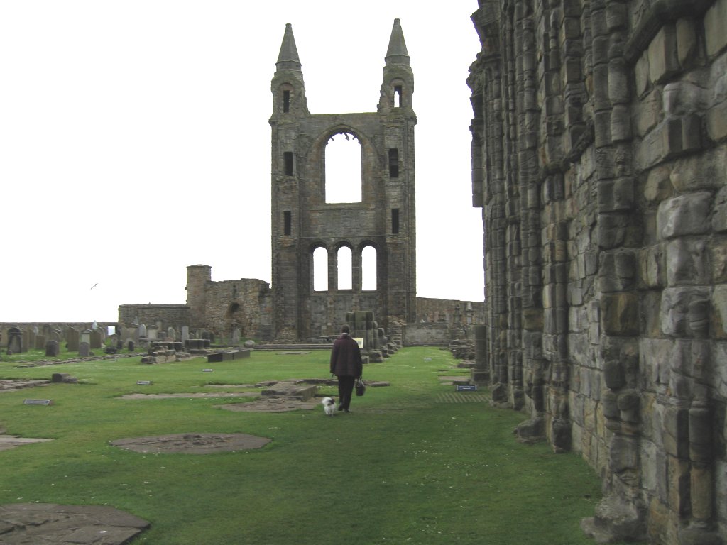 Since this was to be a brief stop, we decided to visit the site of the ruins of the St. Andrews Cathedral. The settlement that became St Andrews rose through the dark ages to an eminent position in the Scottish Church, a process that was accelerated when Viking raids led to the removal from Iona of St Columba's relics in 849AD, and with them much of Iona's power base. By 1144 St Andrews' place in the Scottish Church was confirmed with the setting up here of a community of Augustinian Canons. At the same time, an existing band of Culdee clergy, was displaced, eventually finding a permanent home outside the precinct wall east of the cathedral. The first photo below is the ruins of St Andrews Castle which Pat saw down at a promontory.