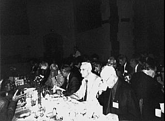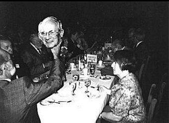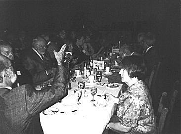 Bill Brock (left) is seen making a bid during the auction held on October 14, 1995. The item, which caught nis attention, was a propeller that disappeared during the Battle of Burwash, 1988-1995. The object, a real "sleeper", was displayed late in the evening and to the surprise of everyone ~ ~ ~ all except Bill, that is. A photo (right) taken earlier that evening reveals that Dr. Roseann Runte, President of Victoria University, was secretly passing data about the propeller to him. In investor parlance, this is called "insider information". Subsequently, the propeller was removed from the list of items to be auctioned, and is displayed in the foyer of Burwash Hall as a deterrent to others who would attempt such skull-duggery in the future.