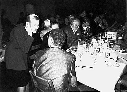 The President of Victoria University, Dr. Roseann Runte, is seen (left) chatting with Bill Brock, a former resident of Middle House, on October 14, 1995. In the course of their discussion, she was overheard to remark that the rendition of the Middle House song was so loud and rowdy that she could not understand the words. Bill (right) obliges President Runte by leading the former residents (at the two tables and representing several decades) in another rousing, earth-shaking chorus of "THE LADY NAMED BROWN".