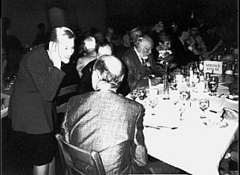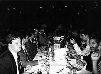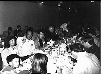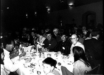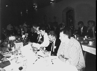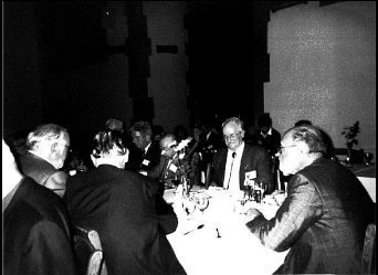 After the dinner at the Burwash Reunion on October 14, 1995, Bill Brock demonstrates his skills as a conjurer. For his final illusion, Bill pulls the head of Doug Ross from beneath his napkin and displays it with a grand flourish (left). Dr. Patricia Ross, seated to his right, registers disbelief and consternation on her face at the thought of a headless husband. It is not widely known that Dr. Roseann Runte, President of Victoria College, is also an amateur dabbler in prestidigitation. In the picture (right), she is seen trying to persuade Bill to divulge the secret of this illusion. "Can it be made permanent?" she asks. Bill shrugs and grows some hair on his head.