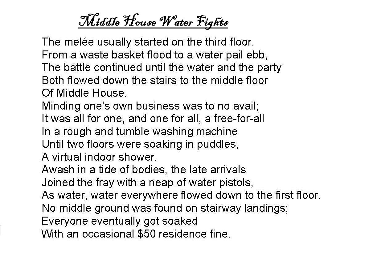 The final act of the day was held at the front door of Middle House. My room as a resident was on the third floor directly above the door. Recent renovations involved the creation of a kitchen in that space. The Burwash dean, Dr. Love, appeared with assistants at the window and announced that he was going to demonstrate the effect of dropping a water-filled balloon from that height. "Imagine the surprise if someone happened to be passing by," he quipped as he let the balloon fly. Perhaps a few of the current residents caught the idea, because the kitchen space was returned to its original purpose withing a year.