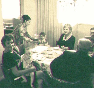 This was the occasion of Jenn's second birthday on April 7, 1970. "Nana Bea" [Nov. 17, 1906 - May 6, 1998] is holding Rob, aged 8 months. Moving clockwise around the table are Pat holding the chocolate cake, Jenn in her high-chair, "Nana Bassett" [April 30, 1911 -], Grandpa Bassett [March 3, 1910 - Nov. 21, 1975] and "Papa Matt" Kotelko [Aug. 9, 1910 - Aug. 23, 1974] |