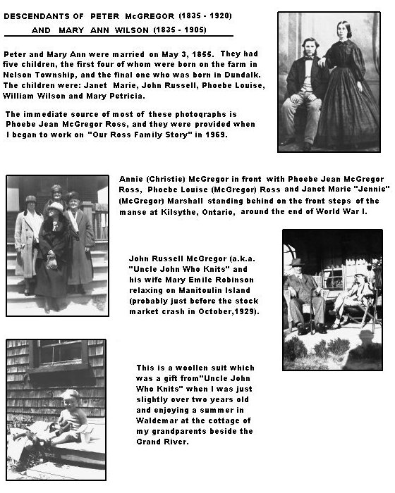 Peter (b. February 25, 1835, at Waterdown, Ontario, - December 1, 1920, at Waterdown) . He spent his late teens at Limestone Hall, owned a farm in Nelson Twp., operated a general store in Cedarville and established a saw mill in Dundalk, where he became the local magistrate and was also noted as the best tooth-puller in the district. Peter's first wife was Mary Ann Wilson (b. 1835 in Nelson, the sixth of eight children in the family of Janet Carr and William Wilson - buried December 25, 1905, at Dundalk and later was moved to Waterdown). Peter and Mary Ann were married on May 3, 1855, and four of their children were born on their farm in Nelson before they moved to Dundalk, as follows: 1. JANET MARIE McGREGOR, (b. 1861) m. James Marshall in 1920. There were no children and both are buried in Milton, Ontario. 2. JOHN RUSSELL McGREGOR (b. February 24, 1863, - d. October, 1940, in Hamilton) m. Mary Emile Robinson (b. October 21, 1866 - d. 1931 in Paris, Ontario). Both are buried in the Pioneer Union Cemetery in Waterdown. I knew Great Uncle John as "Uncle John Who Knits". Their children were: A. HELEN MARIE McGREGOR (August 11, 1892 - June 26, 1970) m. Rev. Henry Charles Frederick Cocks in 1888. Their children were:
