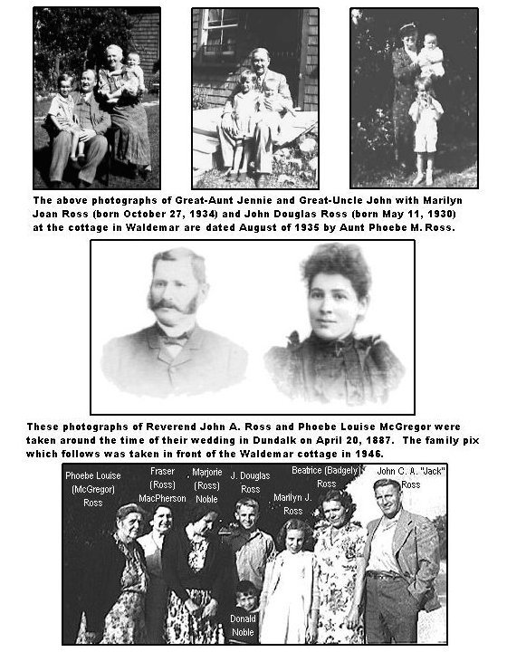 3. PHOEBE LOUISE McGREGOR (b. March 4, 1868, near Waterdown - d. March 19, 1948, in Toronto) was married in Dundalk on April 20, 1887 to Rev. John A. Ross (b. February 24, 1854, in a log cabin north of Uxbridge, Ontario - July 26, 1942, in Toronto). Their children were: A. Ewart Stanley Ross (August 8, 1888, at Meaford, Ontario - drowned August 30, 1906, at Lindon Beach, Lake Erie). B. Mary Fraser Ross (April 1, 1890, at Meaford - April 22, 1965, at Toronto) m. John Wilfred MacPherson (1891 - 1934) of Belleville, who had four children with his first wife, Iva Harry. There were no further children. C. Phoebe Jean McGregor Ross (August 21, 1898, in Churchill - June 24, 1973, in Toronto). She remained single. D. Marjorie Isobel Ross (November 4, 1902, in Churchill - April 28, 1985, at Wasaga Beach) m. Mervin Frederick Noble (January 10, 1905 - 1987) on May 17, 1939. Fred had one son, Gordon Noble (December 25, 1932), with his first wife and another son with Marjorie: 1. Donald Fraser Noble (June 6, 1942) remained single. E. John "Jack" Caven Alexander Ross (February 6, 1904, in Churchill - December 29, 2000, in Oshawa) m. Beatrice Leona Alice Badgley (November 17, 1906, in Lansing,Michigan while her father was working there - May 6, 1998, in Oshawa, Ontario). They were married on July 6, 1929, by Rev. John A. Ross in Toronto and they had two children born in Oshawa: 1. John Douglas Ross (b. May 11, 1930) m. Patricia Dianne Bassett (b. January 21, 1942, in Toronto) on July 1, 1967, and they had two children: Jennifer Elizabeth Ross and Robert Douglas Ross. 2. Marilyn Joan Ross (b. October 27, 1934) m. Bertram "Bert" Lloyd Beckell (May 23, 1930) on September 11, 1954, in Oshawa and they had two children: Jeffrey Lloyd Beckell and Robert Alan Beckell.