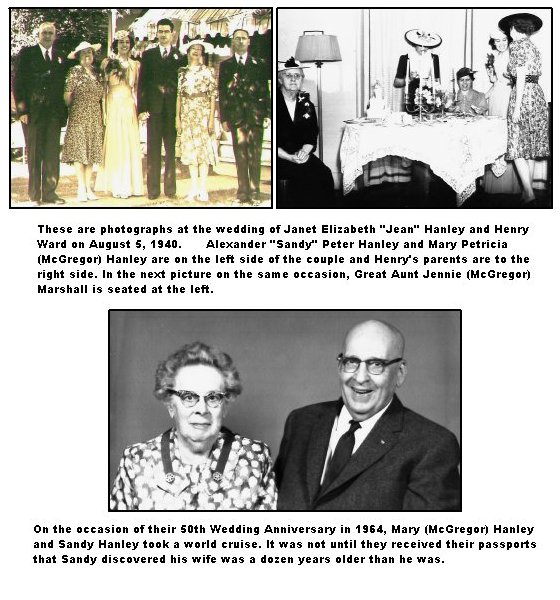 4. WILLIAM WILSON McGREGOR (probably born at Dundalk in 1869 - d. May 17, 1948, in Vancouver) m. Annie Christie, who died about three months before her husband. Great Uncle Bill was a light-hearted "drummer" for Ashdown's, and retired (having been a successful salesman) at the age of 45. There were no children. 5. MARY PETRICIA McGREGOR (b. November 12, 1879, at Dundalk, Ontario - d. December 20, 1969, in Drumheller, Alberta) m. Alexander "Sandy" Peter Hanley at the home of her brother William Wilson McGregor in Cranbrook, BC, on September 6, 1914. Since Sandy was a salesman, they lived in Medicine Hat, Alberta, as well as in Hatton and Wapella, Saskatchewan, before settling in Drumheller, Alberta, in 1921. They had two children. A. Janet Elizabeth Hanley (b. June 2, 1915, in Wapella) m. Henry Gerrie Ward (June 15, 1913, in Edmonton - August 30, 1976, while driving to Vancouver) on August 5, 1940, in Drumheller. They lived in Edmonton, Alberta. Their children were: 1. William Peter Ward (b. February 11, 1943, at Wetaskiwin) m. Patricia Caroline Suitor (b. October 11, 1943) on September 30, 1967. (Living in Kingston) 2. John Edward Henry Ward (b. May 3, 1946, in Edmonton) is married and living in London, Ontario. B. William Hanley (b. September, 1917, died at 3 months). |