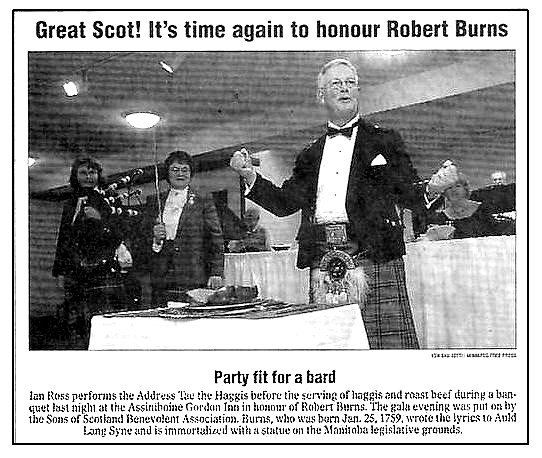 The Burns Dinner was held in the Club Room at the Fort Garry Hotel on January 29, 2005. The programme included "The Immortal Memory" by Archie McNicol, a fable about "The Flower of Scotland" by Al Newton and a theatrical and occasionally violent "Address To The Haggis" by Ian Ross (similar to the event pictured above). For more details see the Fall 2004 and the Winter 2005 Clan Ross Canada newsletters.