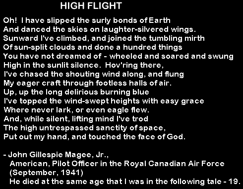 Fred "Bud" Gimblett, another recent pilot, showed up at about this time, and I decided to try the newest aircraft, the 90 horsepower Aeronca FMX. It was a much more satisfying experience to outpace the slower Aeronca DNO that Fred flew and it gave me an opportunity to shake off the jitters from my previous flight. My next flight, also for 20 minutes, was one month later due to my lack of funds. March 06, 2000 |