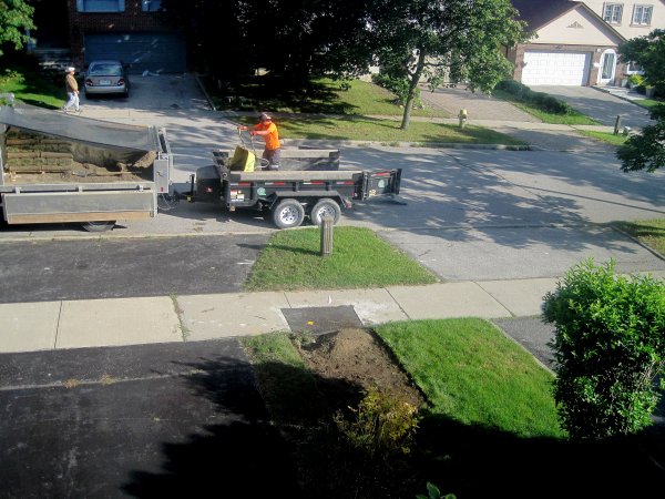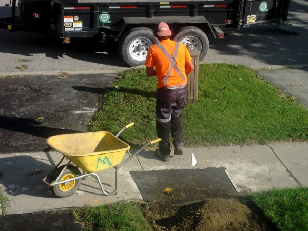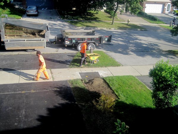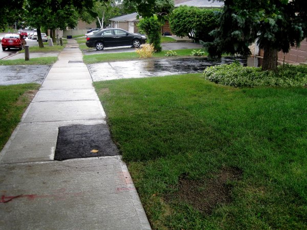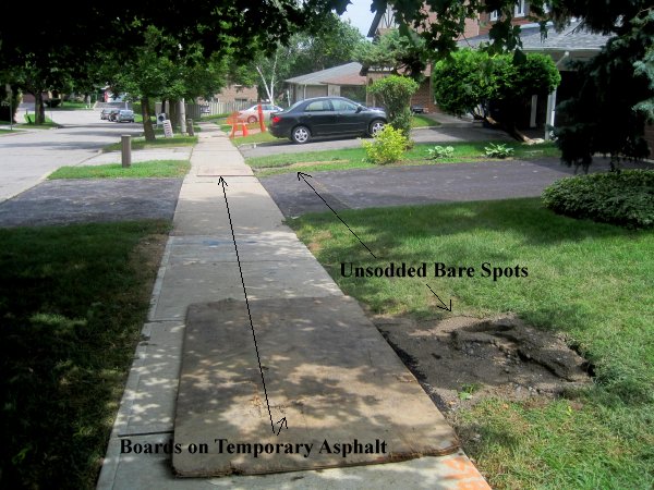Alas, there was a problem. After completing the resodding, the workers left the Bell telephone cable exposed across the driveway along the sidewalk's north side (i.e. nearest our home). In the Fall, we warned Siddiqur Rahman, Bell Field Sales Consultant, that the cable would be torn apart after the first snowfall. That is exactly what happened when our snowplow service cleared our driveway. Within 24 hours our phone was connected to our neighbour;s line, with the promise that the regular line would be restored in three weeks! What a ridiculous claim! We won't hold our breath waiting for the next foul-up. The powers-that-be seem to delight in wasting our money with "needless make-work projects". |