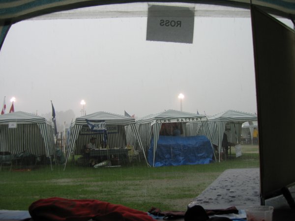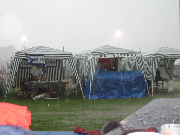 The sunshine of the Saturday morning quickly changed around noon to heavy rain and some hail. The dancers reported that ten tents were destroyed by the storm after their events were moved into the arena. Some cars were stuck up to the axles in the upper field parking area. The tents along the Avenue of Clans were flooded. Everyone had wet footwear, which became caked with mud as they slogged through the drenched paths.