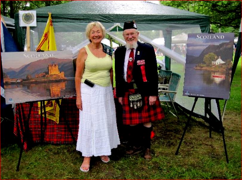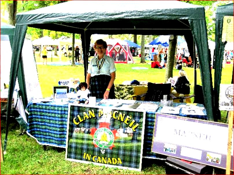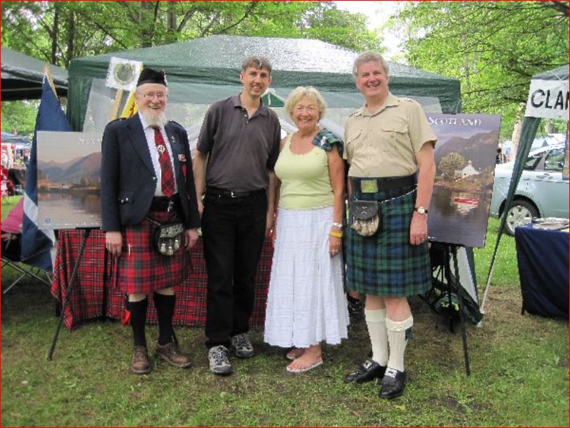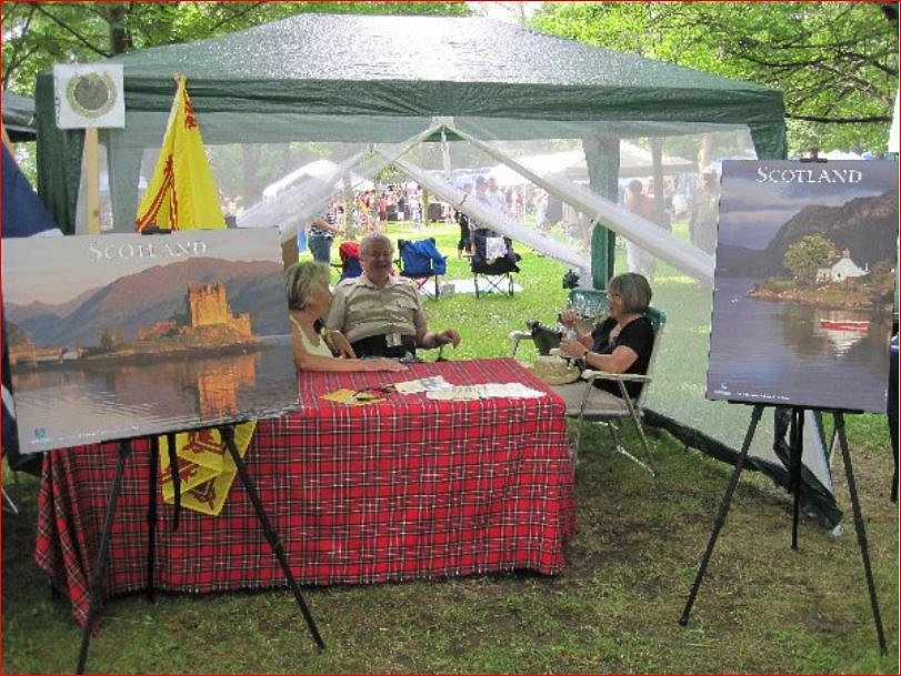 The tent for the Scottish Studies Foundation was in the area of the Celtic Clans at the grounds of the Highlands of Durham Games in Uxbridge. Our GPS device did not accept Uxbridge as a destination for some unknown reason, but we arrived very shortly after the gates opened at 7:30 AM in any case. When Maggie McEwan arrived, we helped to set up the easels and displays of Scottish scenery. President David Campbell and Dr. Graeme Morton (with his son Sam) arrived before the opening ceremonies and the parade. Sam looked after the tent while the rest of us joined the clans in their procession.