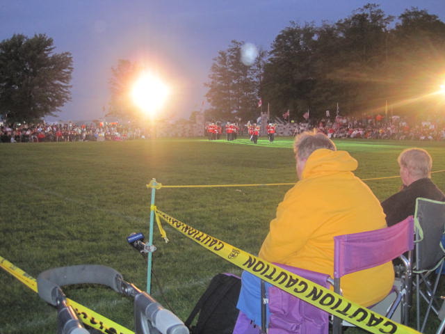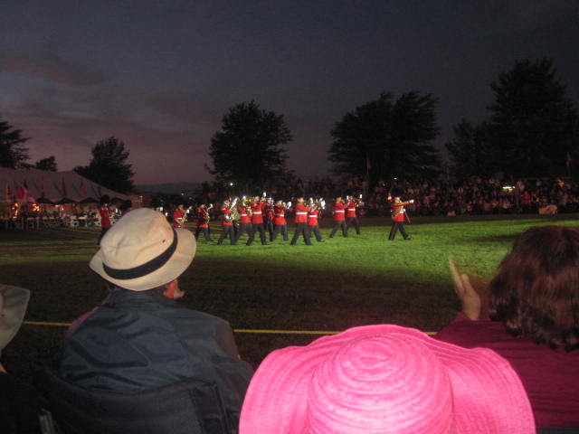 The band of the Royal Regiment of Canada, formed in 1863 and now based at Fort York in Toronto, is the oldest permanently organized band in the Canadian Forces; they featured vocals by Danielle Bourne. The very lively out-of-focus Tommy Leadbeater finally appeared at centre field. Among the other performers was the Highland Creek Pipe Band. David Whycall's internationally acclaimed fire works display concluded the tattoo.