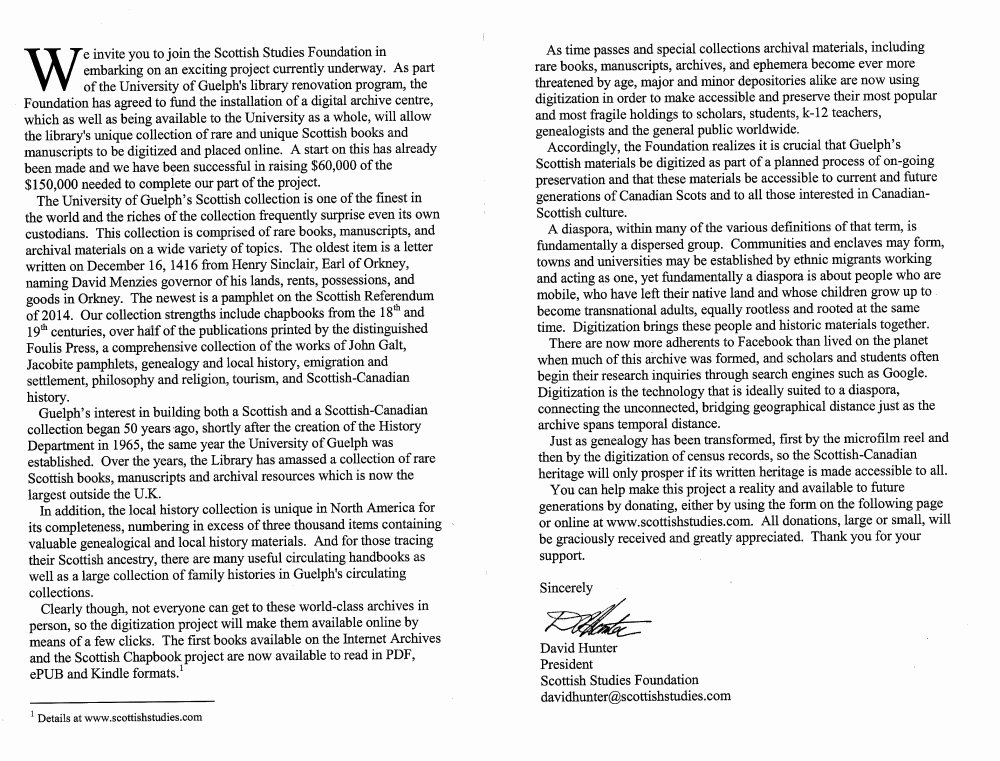 From "The Main Course" in the Official Programme, I have selected the timely talk given by Dr. James Fraser, Chair of the Scottish Studies Centre in the History Department at the University of Guelph. We appreciate the information about the Digital Archive Project, and include a scanned copy of the pamphlet by David Hunter, President of the Scottish Studies Foundation, for anyone who wishes to support this project. [Contributions may also be sent directly to the University of Guelph.]