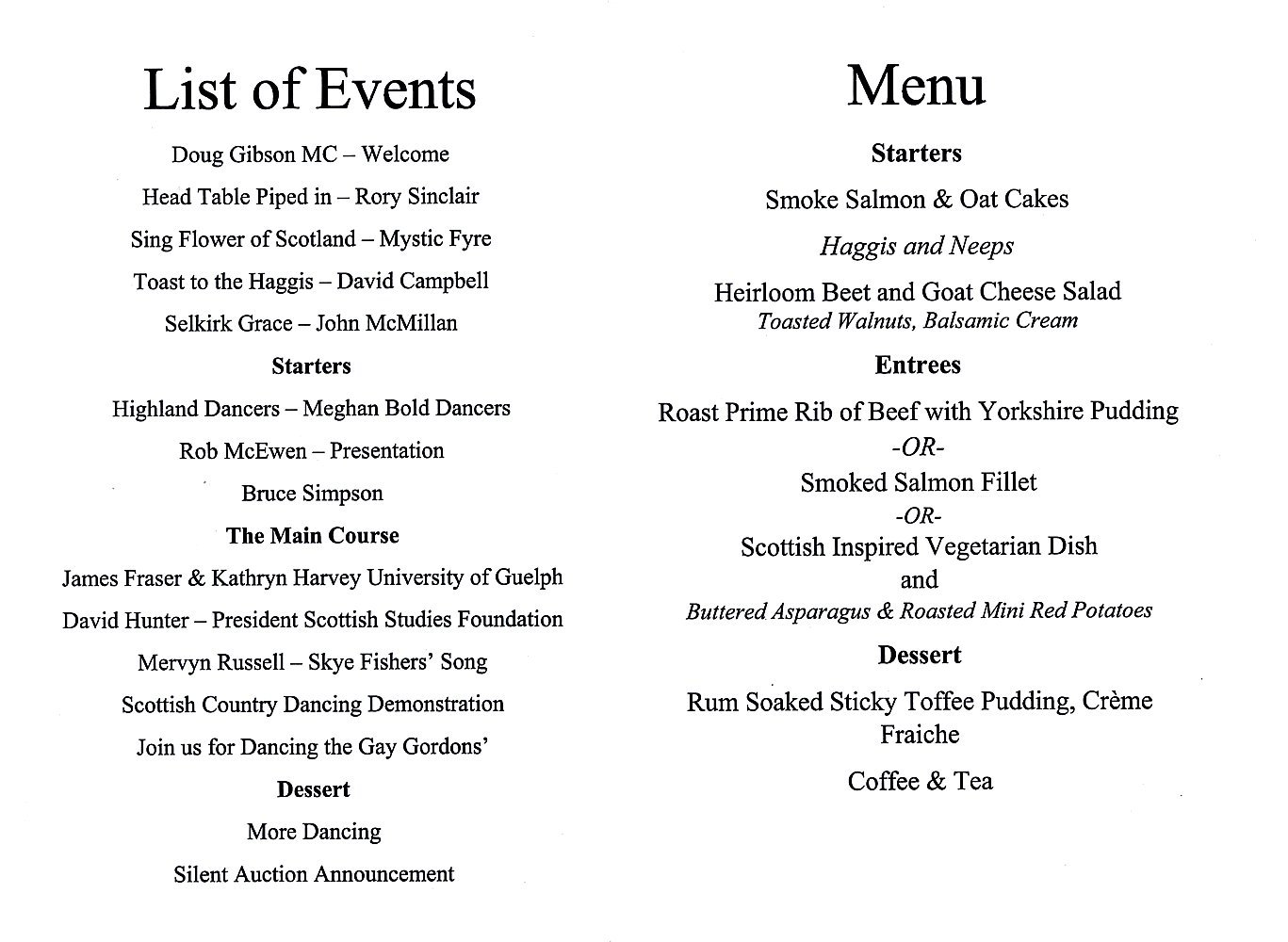 At the top of the List of Events, Douglas Gibson, Master of Ceremonies, welcomed everyone and set a festive mood for the evening. The Head Table was piped in by Rory Sinclair. The Mystic Fyre band played Flower of Scotland, and invited everyone to sing along. After the Haggis was piped in by Rory, David Campbell delivered his inimitable Toast To A Haggis by Robert Burns. John McMillan, the Foundation and Society Secretary, delivered the Selkirk Grace,