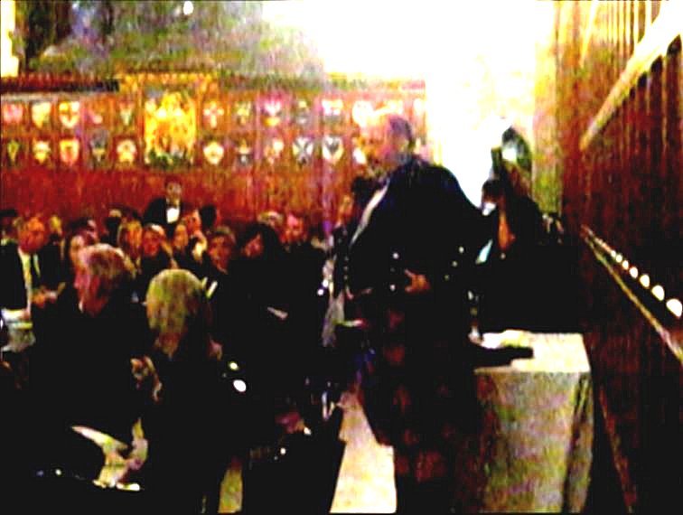 Names were checked at the entrance. The grainy quality in the photos may be explained by the fact that they were captured from the videos in poor lighting conditions. [Ditto for the videos. We did our best.] Pictures show the guests in the reception area and the Highland dancers in the corridor. Jeanne Isley's paintings were on display for a silent auction later in the evening.