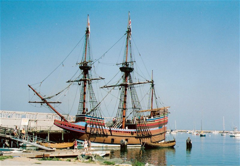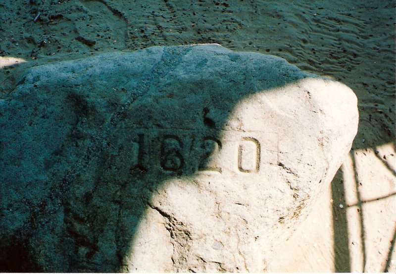 On the way to Hyannis, Massachusetts, we drove to Plymouth where we located the "Plymouth Rock" which had been mentioned in stories by the Pilgrims. The upper portion weighing many tons, had been removed in 1774 to a safe location at the liberty pole square in front of the meeting-house before its move to the Pilgrim Hall Museum. In 1859, the Pilgrim Society laid the cornerstone for a canopy over the base of the Rock on the wharf. The protective canopy itself was finished in 1867. In 1880, the Pilgrim Society moved the top of the Rock from its location inside the fancy iron fence in front of Pilgrim Hall Museum and reunited it to the base of the Rock under the Canopy. It was at this time that the date "1620" was cut into the Rock. That is the "official" tale which was passed down through the generations of descendants. In the harbour floats a replica of the Mayflower with its the solid oak timbers and tarred hemp rigging, wood and horn lanterns and hand-colored maps, which have all been carefully recreated to give visitors a sense of what the original 17th-century vessel was like. Visitors may wish to look at the Map of Plymouth showing the locations of the rock and the ship. >