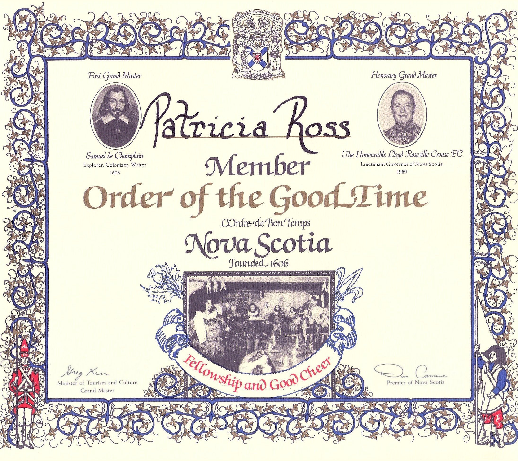 Our next stop was much more enjoyable. A short side trip took us to the site of Port Royal, Samuel de Champlain's fort where he established the "Order of Good Times". You may take a look at both Pat's Membership Certificate and Doug's Membership Certificate in the order.