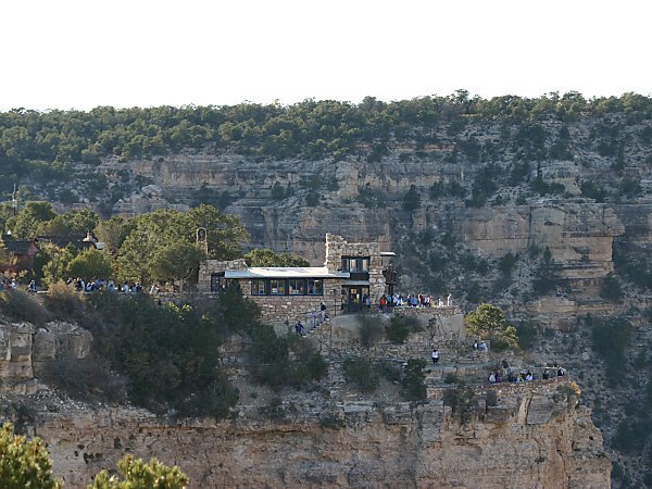 - The Three of Us: Here's our obligatory photo at the south rim of the Grand Canyon after we had booked into the Thunderbird Lodge (at the Bright Angel lobby). - Lookout Studio: Lookout Studio was built in 1914 to blend in with the scenery. - Canyon View: The water level of the Colorado River was low due to the lack of rain. We were treated to a thunderstorm and heavy rain overnight.
