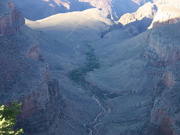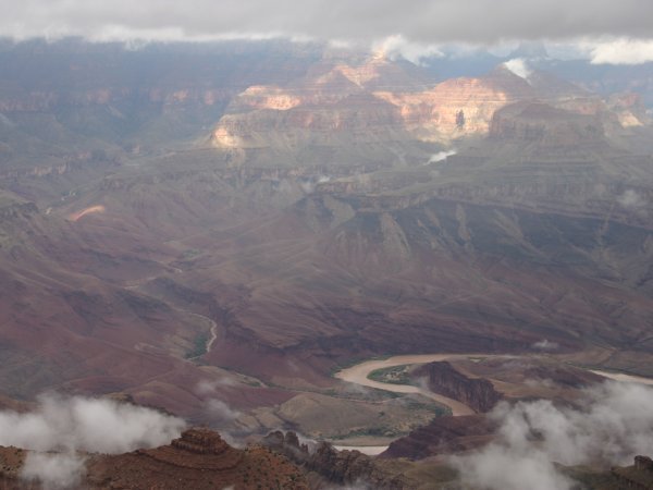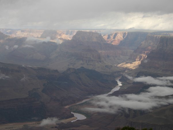 - Canyon View: How do you choose from so many spectacular views? Luckily the heavy rain held off until we had supper. - The Colorado River: The river was easier to see with the eyes than with the camera, but Jenn's telephoto made this picture possible. - The Lodges at the South Rim: Kachina and Thunderbird Lodges were located between the El Tovar Hotel and the Bright Angel Lodge.