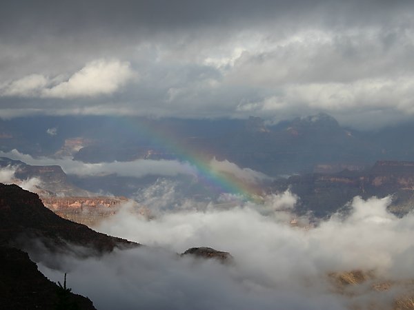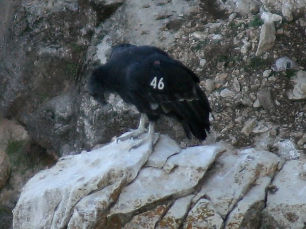 - California Condor #46: The numbers of these rare birds are increasing gradually. For more information, click here for a link to one of the websites dealing with further details. - Rainbow over the Canyon: As we headed east along the canyon road the next morning, we made several stops at the lookout points along the rim. I guess that we were not alone in noticing the rainbow, because others also stopped to take pictures. - Cliffs in the Clouds: After the night rain, the colours of the vegetation seemed to be brighter and sharper. Each of our stops provided opportunities for great pictures.