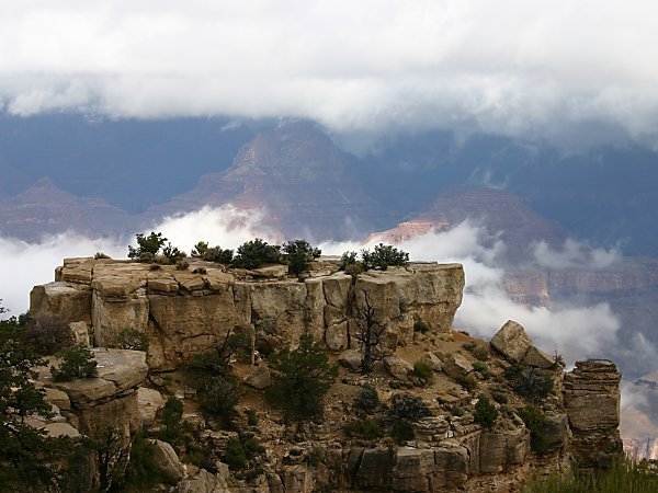 The Spanish, with the assistance of Hopi guides, were the first Europeans to see the Grand Canyon, but they found its 10 mile width impassable. As we arrived at the Xanterra Thunderbird Lodge on the South Rim, the parking situation was impossible and a slight drizzle dampened our spirits for a brief time. The local people, however, were happy that a thunderstorm was forecast that night after a few weeks of drought. Fortunately, the heavy rain held off until much later (after we enjoyed our supper). Just look at the excellent photographs which were taken on Saturday before the storm . . . and on Sunday morning as we were departing.