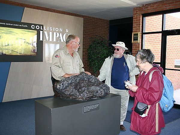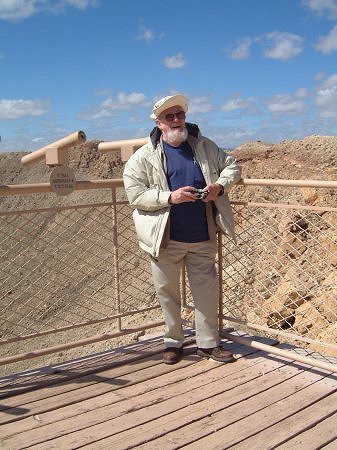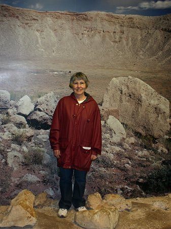 - "Pat in the Crater": In the Learning Centre, we stood in a mock-up of the bottom of the crater to have a picture taken. - Pat Taking My Picture: Jenn took this photo of Pat taking my picture on the Observation Deck. - Here is my Photo at Meteor Crater: This was the photo of me taken by Pat.