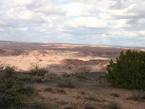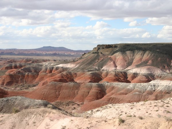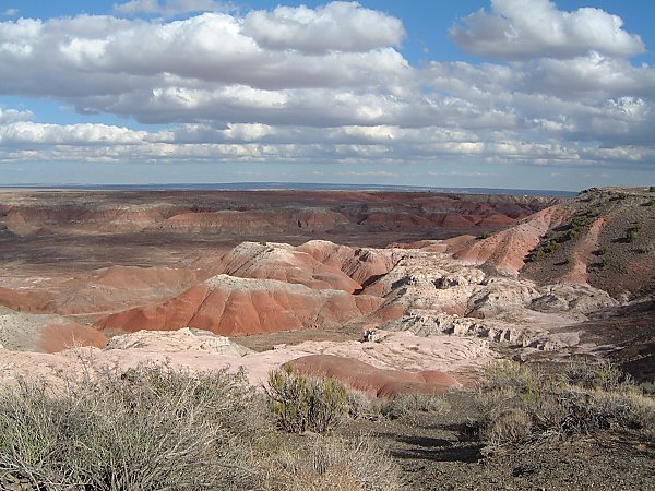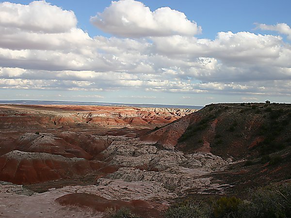 - More Badlands: Clay gullies lay at the feet of the carbonaceous cliffs. The badlands of the Painted Desert extend to the horizon.