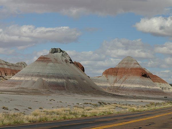 - The Tepees: Halfway along the road through the Petrified Forest National Park in the Painted Desert, a sign points to The Tepees lookout. These cone-shaped formations have white layers of sandstone capped with clay. The darkest layers have a high carbon content, and the dark reds are mainly iron-stained siltstone. Reddish bases are stained by hematite (iron oxide). - Plenty of Colours: All of the colours at The Tepees are present as we proceeded through the Badlands of the Painted Desert. - Badlands of the Painted Desert: The features of this landscape are very similar to those found around Drumheller, Alberta, where animal and plant fossils are also found.