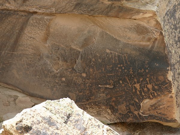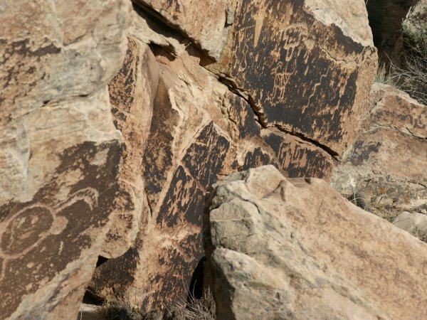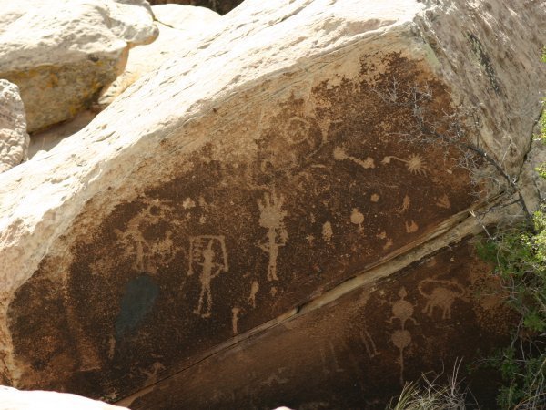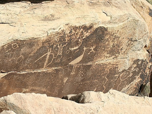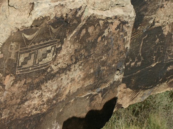 - Humans, Animals and Geometric Shapes: Thus far, nobody has found a Rosetta Stone to assist us in the translation of these petroglyphs. Some shapes and figures carved by the Puebloan ancestors are repeated from site to site, and some are unique to an area. This suggests that the latter are tribal symbols. - A Kokopelli Figure?: In the upper left-hand side there appears to be a Kokopelli or humpbacked flute player. His was the spirit that kept the land fertile. - A Bird Holding a Human: Find the bird holding a human form in its beak. This may simply illustrate a common tale or legend.