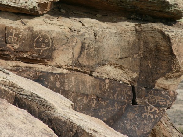 - A Face in the Crowd: Some faces have more expression than others. The faces with circles for eyes and mouth may represent a Hopi god of death (according to one source). - The Rising Steps: In the Mesa Verde State Park of Colorado, we learned from our guide that steps may symbolize the number of generations. We also learned that interpretation varies amongst today's descendants of the Anasazi or Puebloan ancestors.