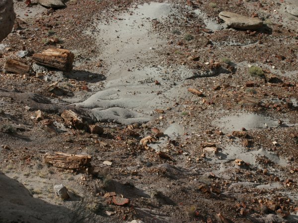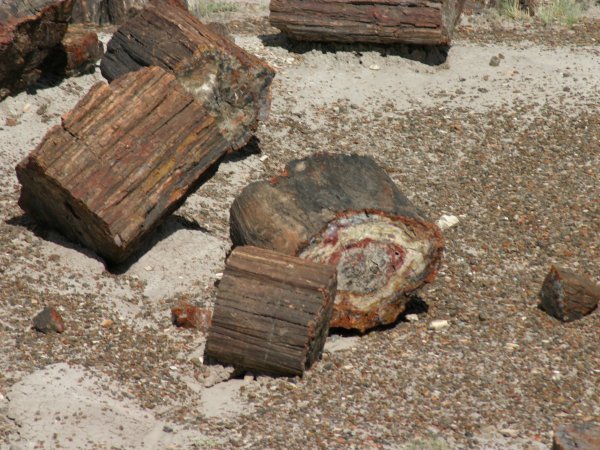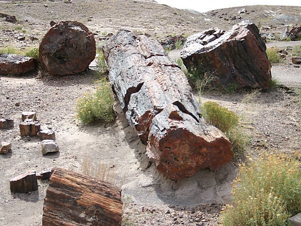 - Colourful Crystals: The various colours in the crystals come from combinations of minerals, such as iron, carbon, mandanese, and sometimes cobalt and chromium, which blended with the silica-saturated water. - More Large Deposits: These large petrified logs were also deposited in the Painted Desert when old bluffs disintegrated. The process is a continuing one. The logs were cracked by the stresses created by an upheaval which lifted the area far above sea level. - Large Logs: All of the petrified wood, including these logs, were once held by the layers of hardened sediments and clays which formed the ancient bluffs. Weather, wind and water continue to expose the fossilized remains of earlier plants and animals.
