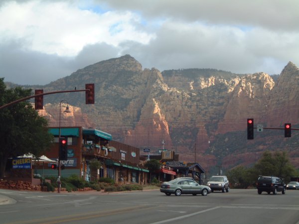 After leaving the Grand Canyon National Park, we drove south on highway 89 to Sedona. A particularly scenic part of this trip was the Oak Creek Canyon. When we arrived at the Hampton Inn, we found that our room had a TV as well as an internet connection for Jenn's laptop. Our previous accommodations had refrigerators, but no contact with news from the outside world. The inn also provided snacks in the lobby all hours of the day . . . as advertised. The weather gave Pat and Jenn good opportunities for pictures at sunset and sunrise.