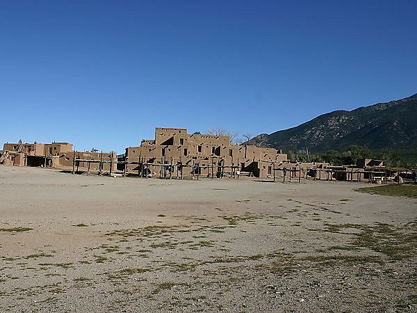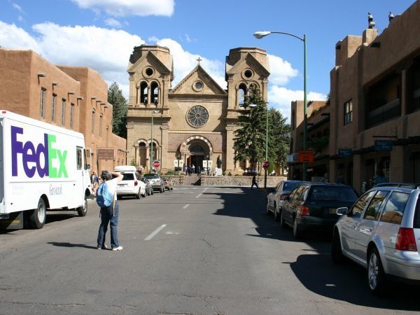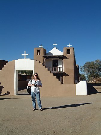 On the way to Taos, we stopped in Santa Fe, New Mexico, where Pat took this photo of St. Francis Cathedral. We paused in Santa Fe for a while at the market places and plazas of the old town, where the streets had names such as Old Santa Fe Trail and Old Pecos Trail and San Francisco Street. At last, there were shops with native pottery and art and reference books. [Jenn took this picture as Pat captured a photograph of the cathedral made famous in films about the Southwest.] Then we continued on to Taos through a varied scenery of forests, flatland, and mountains. ![]()