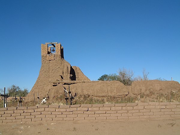 - 1619 St. Jerome Church Ruins: Admission to the Taos Pueblo was $10 per person plus $5 per camera. The fees were paid at an Admissions Booth, where visitors received a map with incomplete descriptions and rules about no climbing, respect of the "Restricted Area" signs, and warning against entering or drinking water from Red Willow Creek. One of the first sights on the Tour Route are the ruins of the St. Jerome Church built in 1619 by the Spanish missionaries. - 1850 St. Jerome Church: Jenn stands in front of the adobe-styled St. Jerome Church, which was built in 1850 to replace the old church which had been destroyed in the Pueblo Revolt of 1680 and during the Mexican-American War in 1847. - The Old Graveyard: The old graveyard is beside the ruins of the St. Jerome Church built in 1619. The dog may be a frequent visitor within this enclosure.