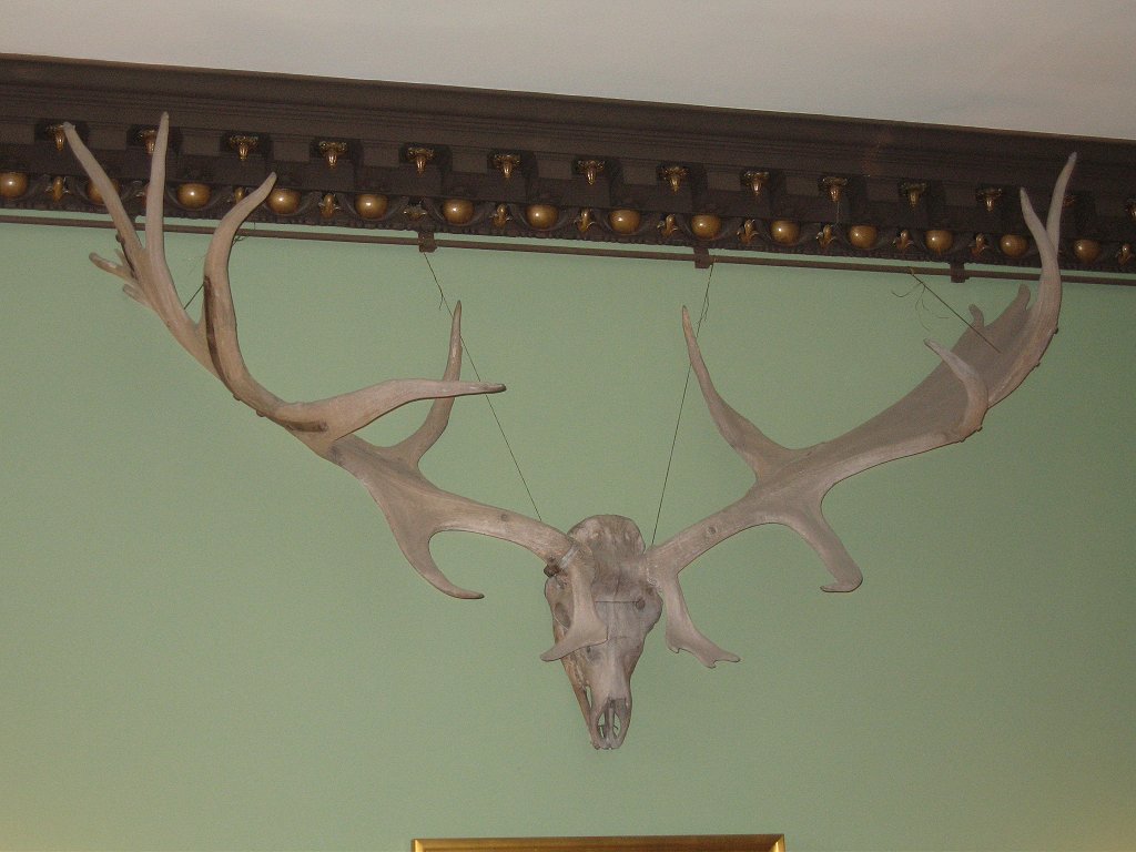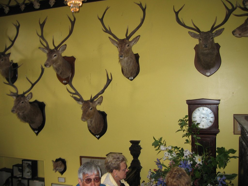 From the Dining Room window, there was an excellent view of Duart Castle, once Guthrie property, but sold to the 26th Chief of Clan Maclean in 1911. Over the fireplace is the head of an Irish Elk, extinct for over 10,000 years, from Co. Monaghan, with a span of 7 feet 4 inches (but Chris remarks that there is one in a house near Dublin which is 14 feet).