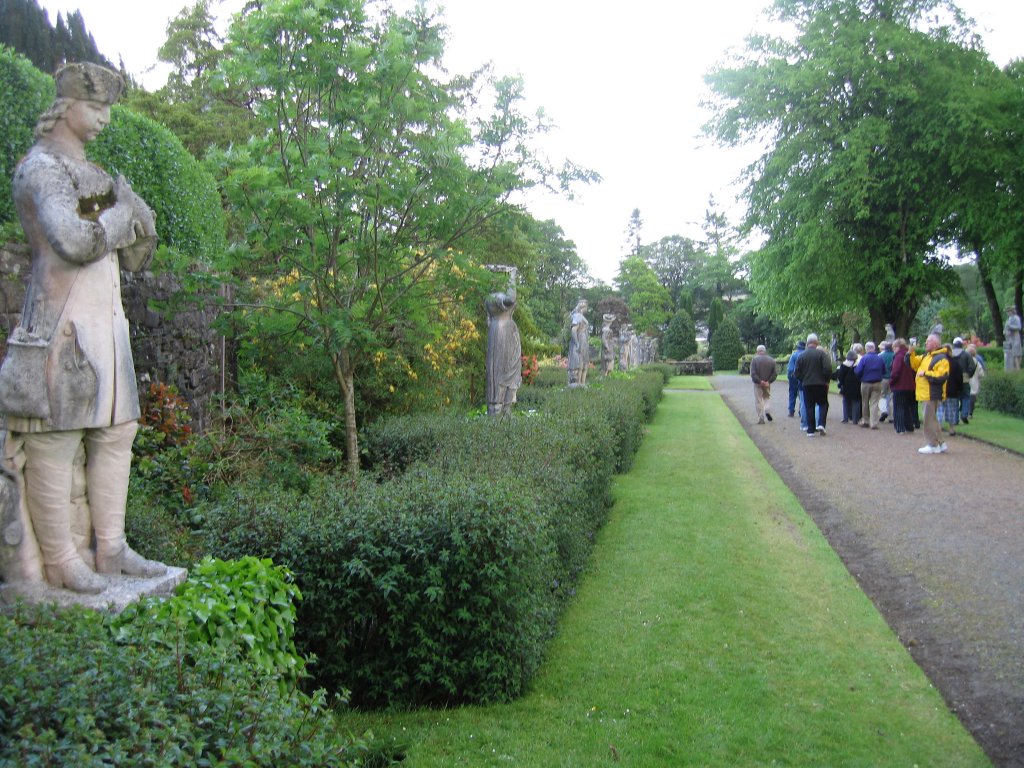 Torosay Castle has 12 acres of ornamental gardens. The featured Statue Walk is lined with 19 life-size limestone figures which were sculptured by Antonio Bonazza near Padua, Italy. Chris James mentioned that many of the trees in the garden are cared for by Torosay on behalf of the Royal Botanical Garden, Edinburgh.