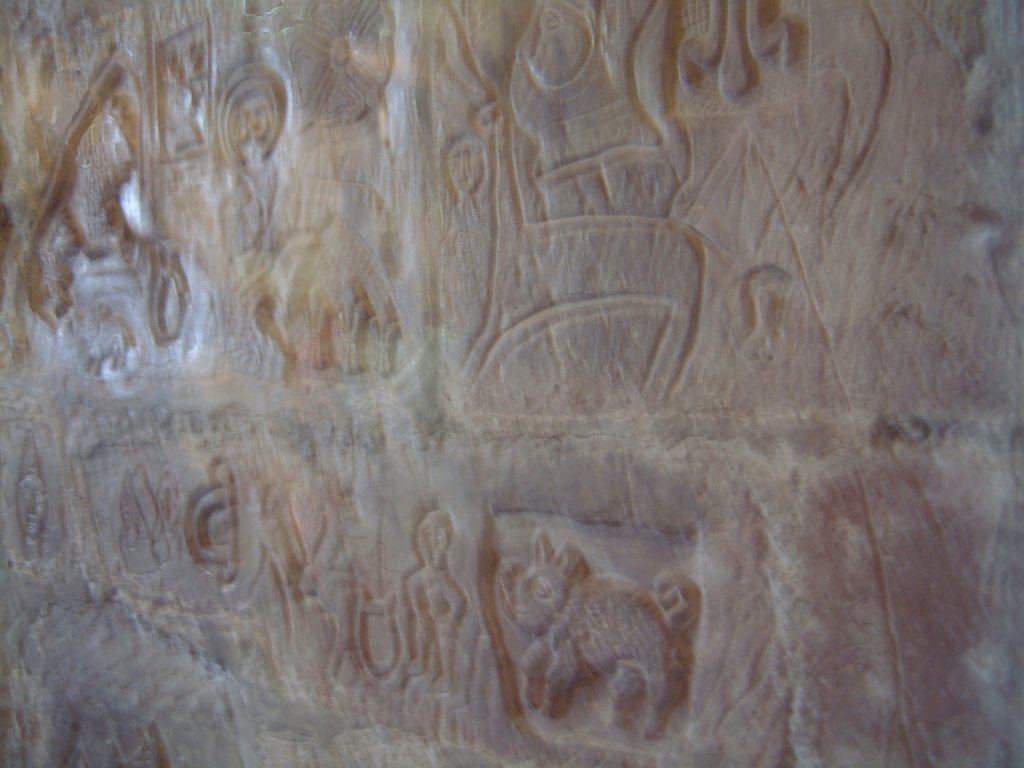 Photos below include an impression of today's restored Carlisle Castle, a scene overlooking Carlisle, a stone of Roman origins used in an officer's bedroom (bed not of standard length with a canopy over head to prevent rats from dropping on the sleeper), yet another reused stone in a doorway, and some carvings by captives in 1480.